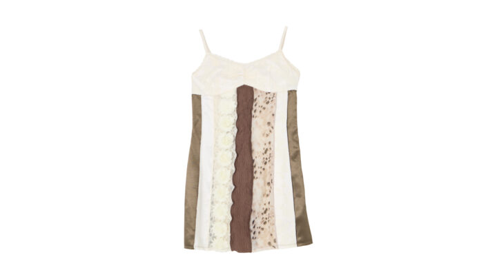 異なる素材を縦に切り替えた、存在感のあるキャミソールワンピース。透け感のあるレースや立体的な生地を組み合わせ、動きのある表情を生み出しています。程よくゆとりを持たせたシルエットで、1枚での着用はもちろん、デニムとのレイヤードも楽しめる一着です。